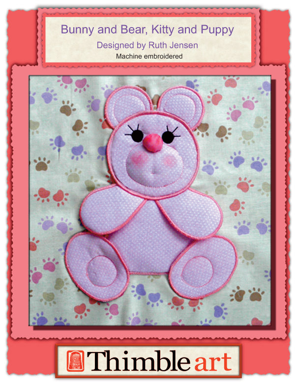 Dimensional machine embroidery bunny, bear, puppy, and kitty pattern. They are a 10" finished block that will fit into your children's quilts for an adorable addition that is like nothing you've ever seen before. We have a great video tutorial that will help you succeed.