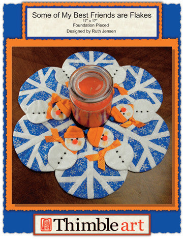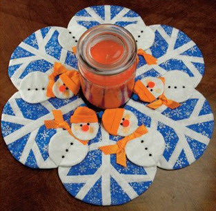 This table topper has six paper pieced sides which make up one beautiful snowflake. The fold 'n stitch between seams create six dimensional snowman, complete with mini hats and scarves. If you dress the snowmen up in Red and Green, this candle mat is perfect for spreading Christmas Cheer. Or, dress the snowmen in a variety of colors and leave this Winter Decoration out throughout the Holiday Season!