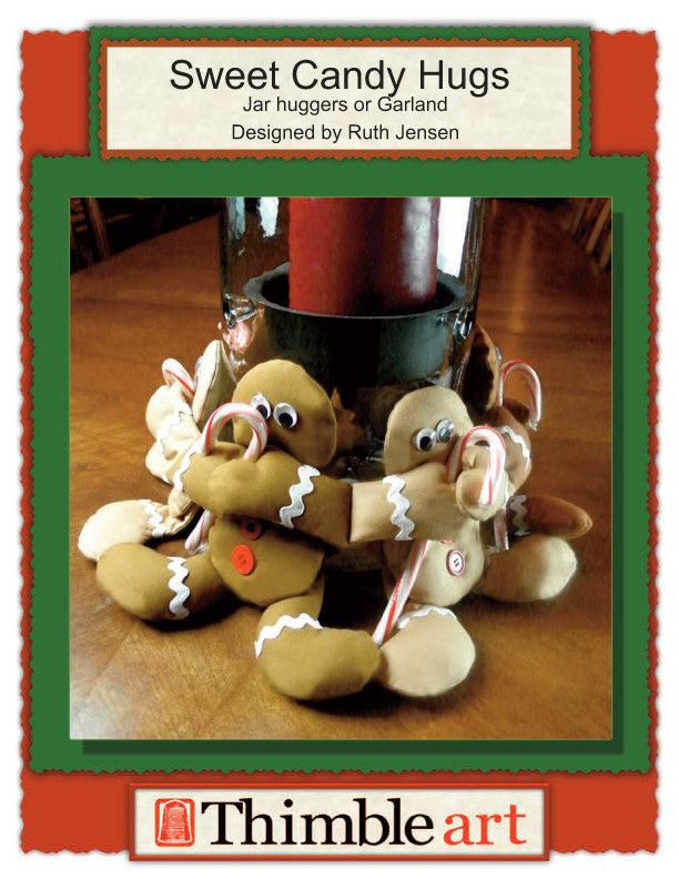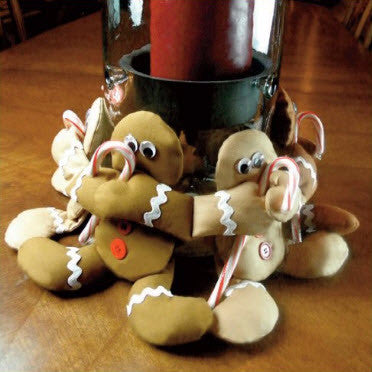 These cute Gingerbread men join arm and arm in encircling a Christmas Candle or Jar of Sweets as they individually cradle their holiday treat. These dimensional gingerbread cookie shapes are sewn to sit upright and hug a jar or candle, creating an adorable Christmas centerpiece. This pattern is a $3.00 download and also includes a pattern for making a sweet Gingerbread garland.