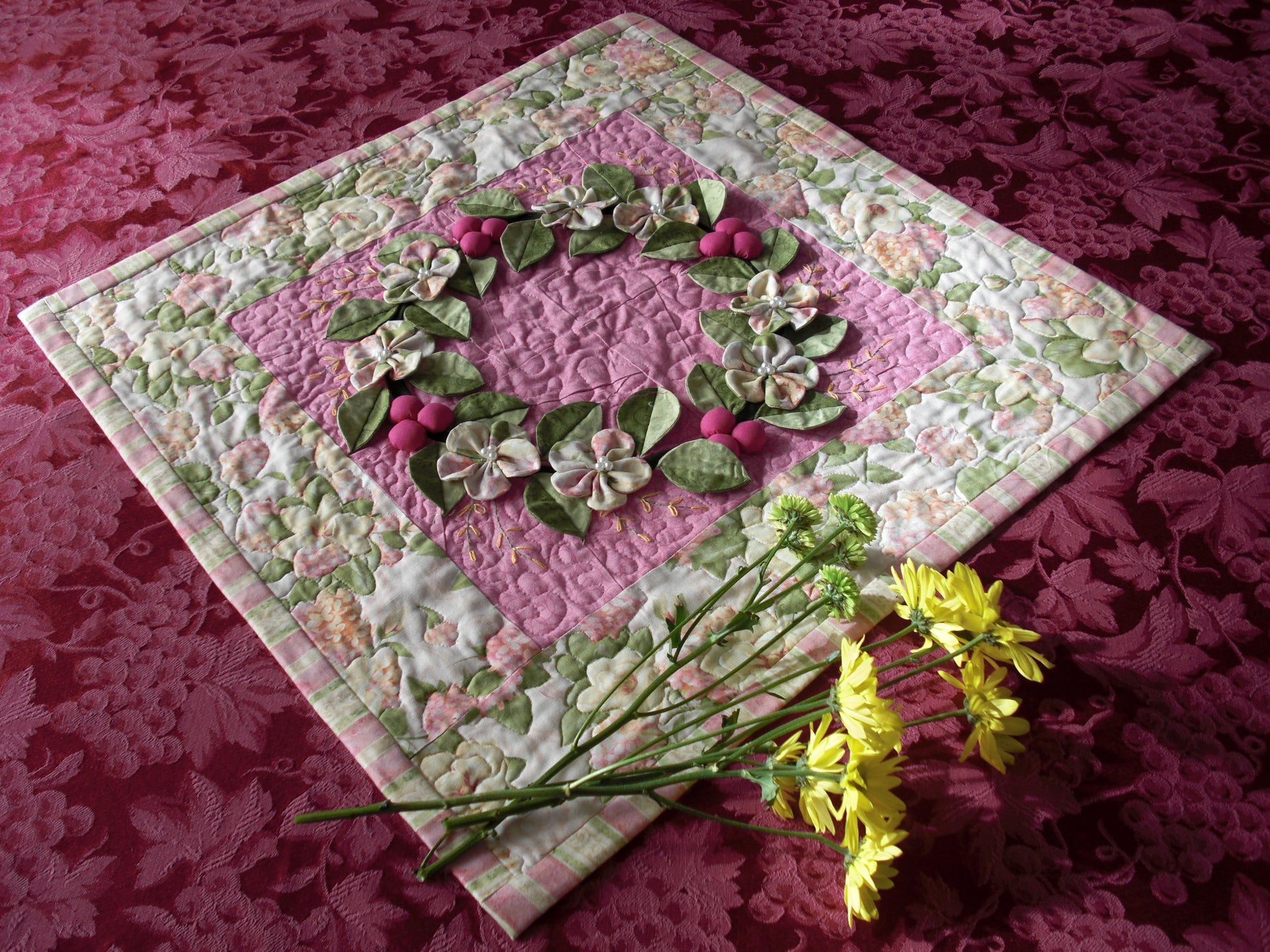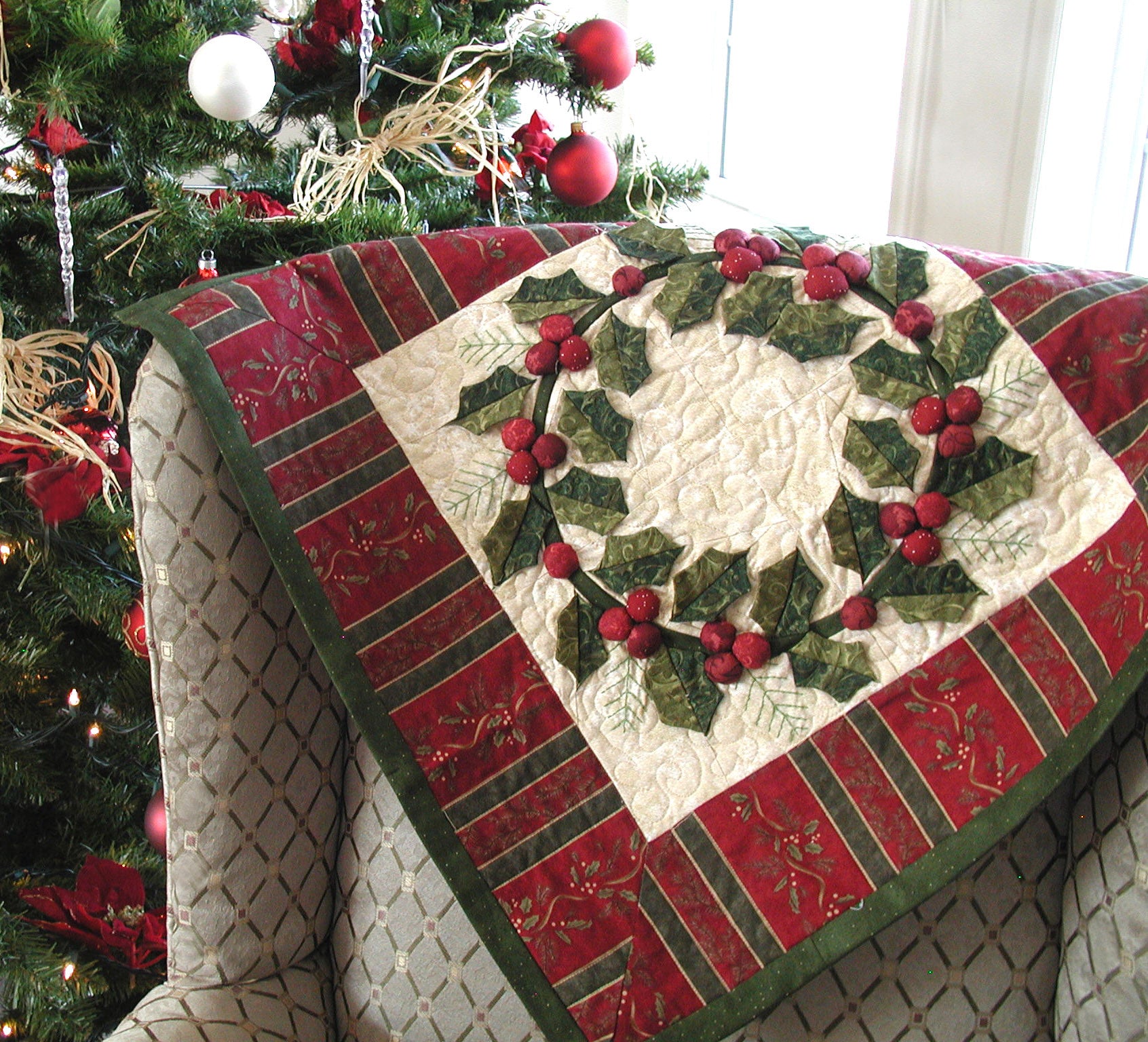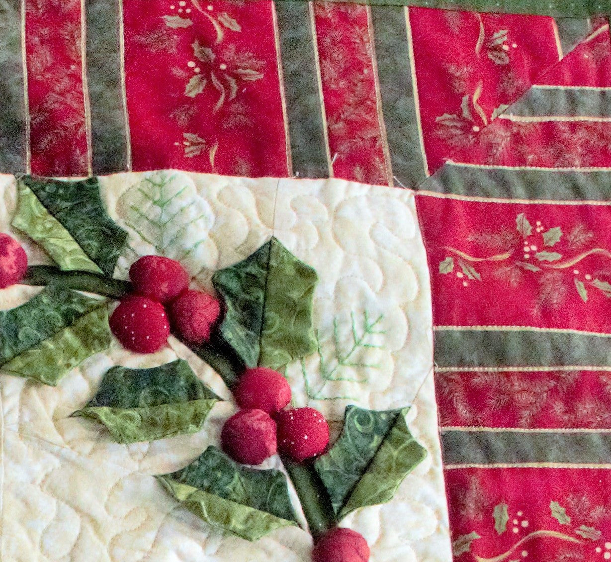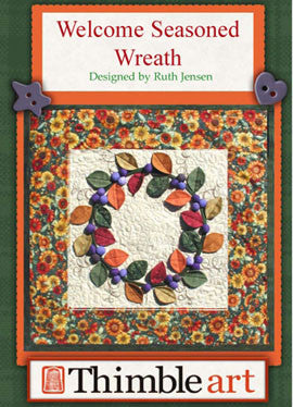 Welcome wreaths are always magical in beauty and appeal. This little quilt brings that magic to thread and fabric and becomes a real show piece. Paper piecing (Foundation Pieced) and other techniques make this a magnified quilt. Choose your season by varying the colors and you have a whole different look. Enjoy the pictures we provided to the left of the large display photo. Mouse over to catch the close ups of the great detail and interplay of vines, berries and leaves.