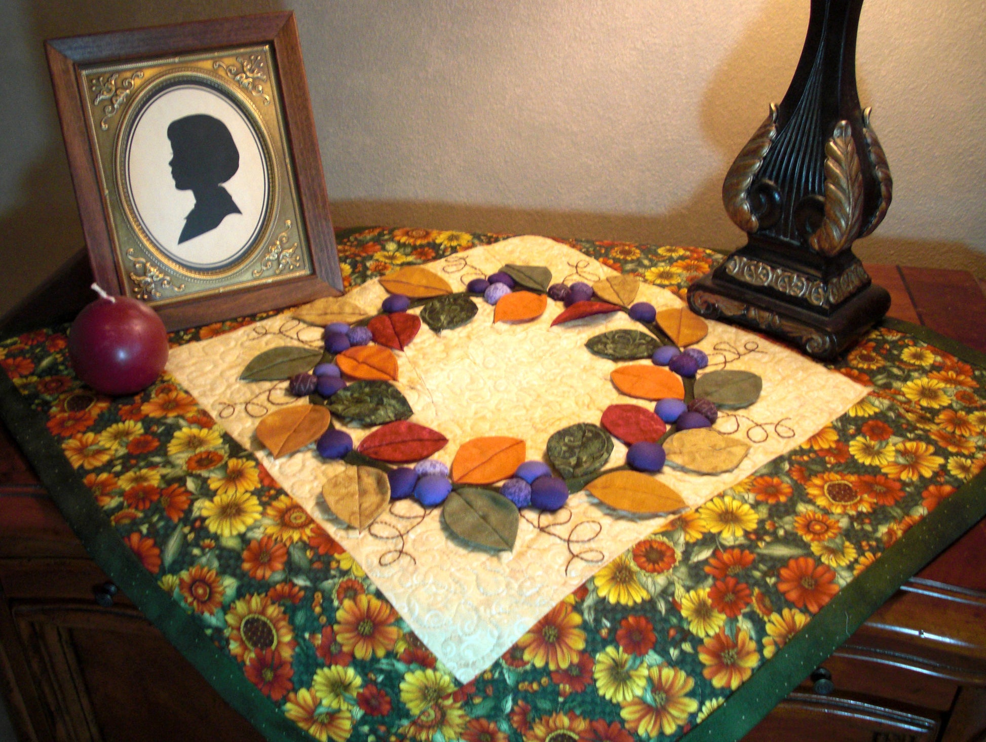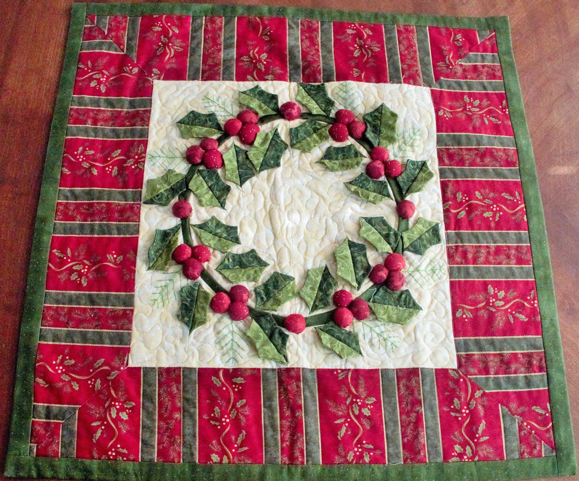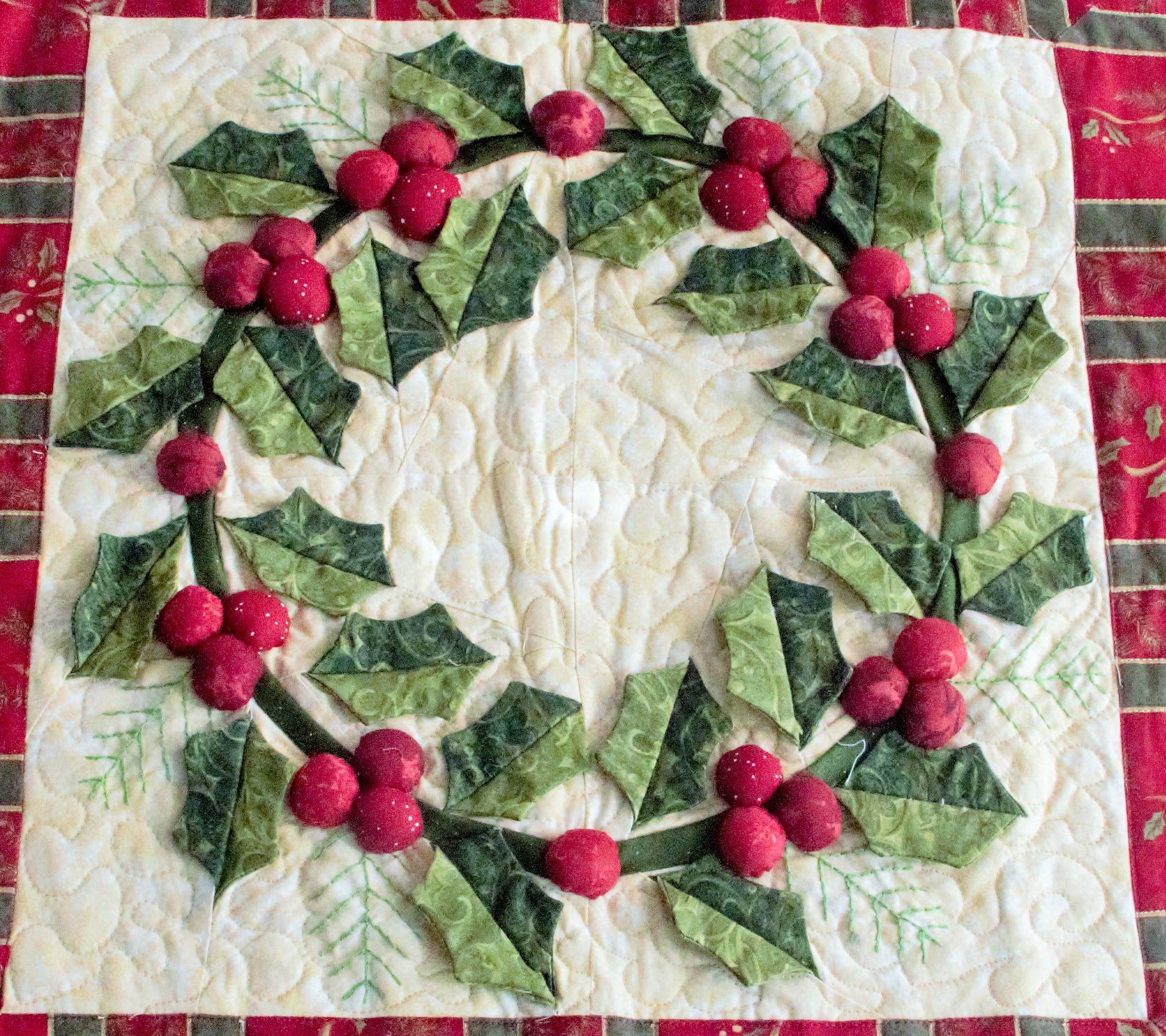 Welcome wreaths are always magical in beauty and appeal. This little quilt brings that magic to thread and fabric and becomes a real show piece. Paper piecing (Foundation Pieced) and other techniques make this a magnified quilt. Choose your season by varying the colors and you have a whole different look. Enjoy the pictures we provided to the left of the large display photo. Mouse over to catch the close ups of the great detail and interplay of vines, berries and leaves.